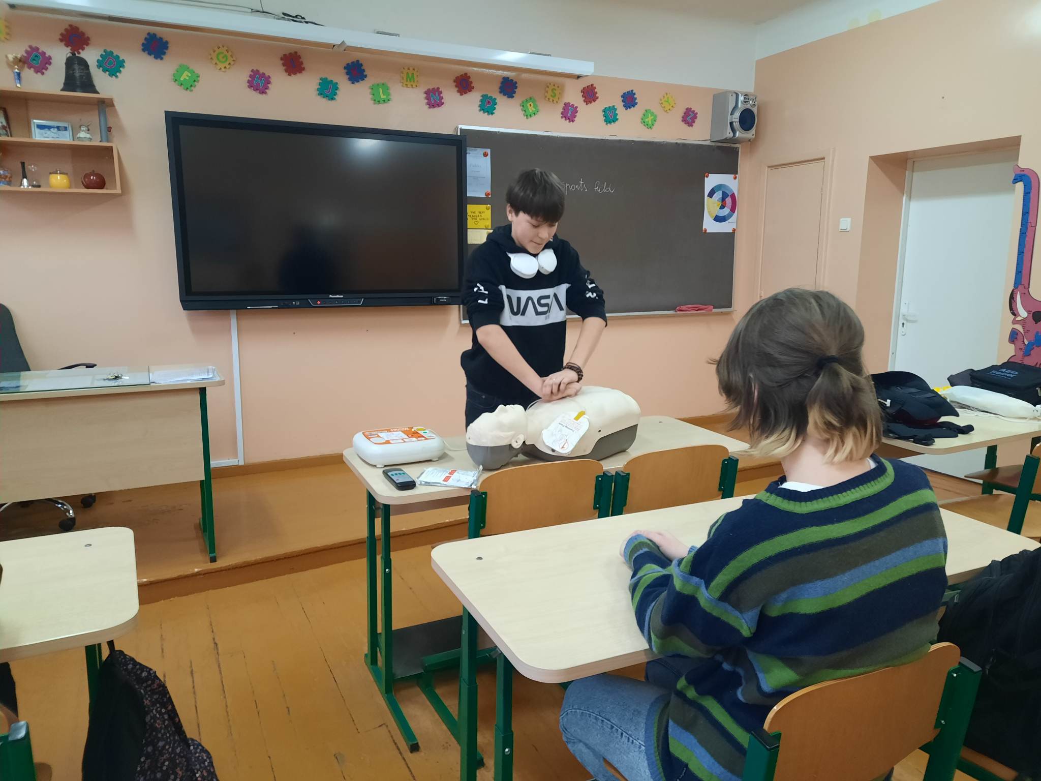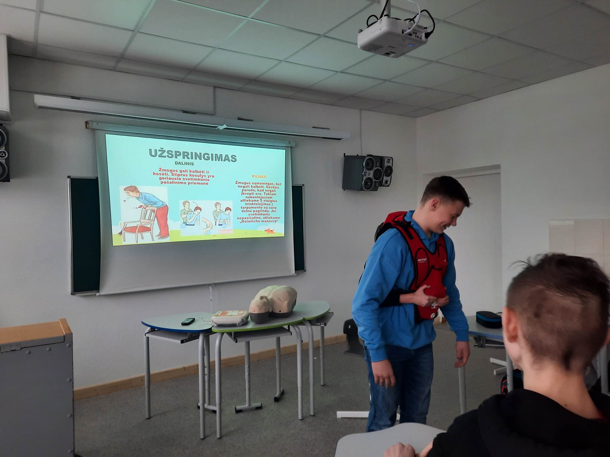 Laiku suteikta pirmoji pagalba gali išgelbėti žmogaus gyvybę! Šiaulių V. Kudirkos progimnazijoje visuomenės sveikatos specialistė pravedė pirmos pagalbos mokymus vyresniųjų klasių mokiniams. Mokymų tikslas – atkreipti dėmesį į pirmosios pagalbos teikimo svarbą. Atlikti praktiniai mokymai, kaip atpažinti užspringimą ir kaip suteikti užspringusiajam pirmąją pagalbą, kaip elgtis nušalus, nudegus, pačiam, draugui ar šeimos nariui. Ypatingą susidomėjimą mokiniams kėlė kaip atlikti pradinį suaugusio žmogaus gaivinimą ir kaip naudoti automatinį išorinį defibriliatorių. Pamokos metu buvo naudojamas gaivinimo manekenas.